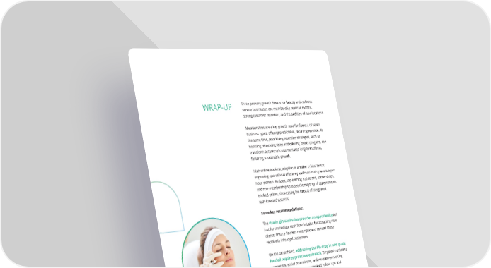 18 WRAP-UP Three primary growth drivers for beauty and wellness service businesses are membership revenue models, strong customer retention, and the addition of new locations. Memberships are a key growth area for five out of seven business types, offering predictable, recurring revenue. At the same time, prioritizing retention strategies, such as boosting rebooking rates and offering loyalty progams, can transform occasional customers into long-term clients, fostering sustainable growth. High online booking adoption is another critical factor, improving operational efficiency and maximizing revenue per hour worked. Besides, top-earning nail salons, barbershops, and non-membership spas see the majority of appointments booked online, showcasing the impact of integrated, tech-forward systems. Finally, keep monitoring industry benchmarks to see where you stand and identify areas for improvement. You’ll make better decisions, set clearer goals, and stay current on trends that matter. Some key recommendations: The rise in gift card sales provides an opportunity not just for immediate cash flow but also for attracting new clients. Ensure flawless redemption to convert these recipients into loyal customers. On the other hand, addressing the 9% drop in new guest footfall requires proactive outreach. Targeted marketing campaigns, social promotions, and revenue-enhancing software features such as automated follow-ups and abandoned cart recovery can help draw in new and existing guests. To capitalize on membership growth, use digital, mobile-first membership, referral, and gift card programs to help your best brand advocates spread the love.