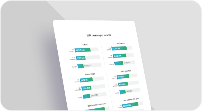 Salons Top earners $1,249,558 High achievers $727,698 Average $459,949 Nail salons Top earners $1,565,846 High achievers $1,189,496 Average $775,812 Barbershops Top earners $477,304 High achievers $356,912 Average $258,379 Membership-based spas Top earners $2,489,304 High achievers $1,842,982 Average $1,320,716 Non-membership spas Top earners $2,098,232 High achievers $1,347,780 Average $795,057 Waxing centers Top earners $974,055 High achievers $716,384 Average $463,384 Medspas Top earners $3,219,354 High achievers $1,776,829 Average $1,035,229 2024 revenue per location 08